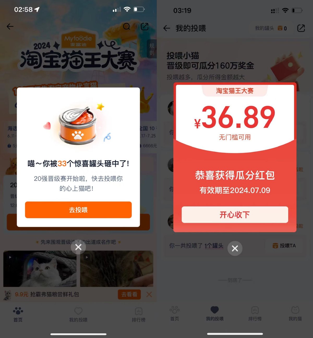 淘宝猫王大赛新一期开始了!根据投喂的总罐头的比例,每轮瓜分40w通用购物红包